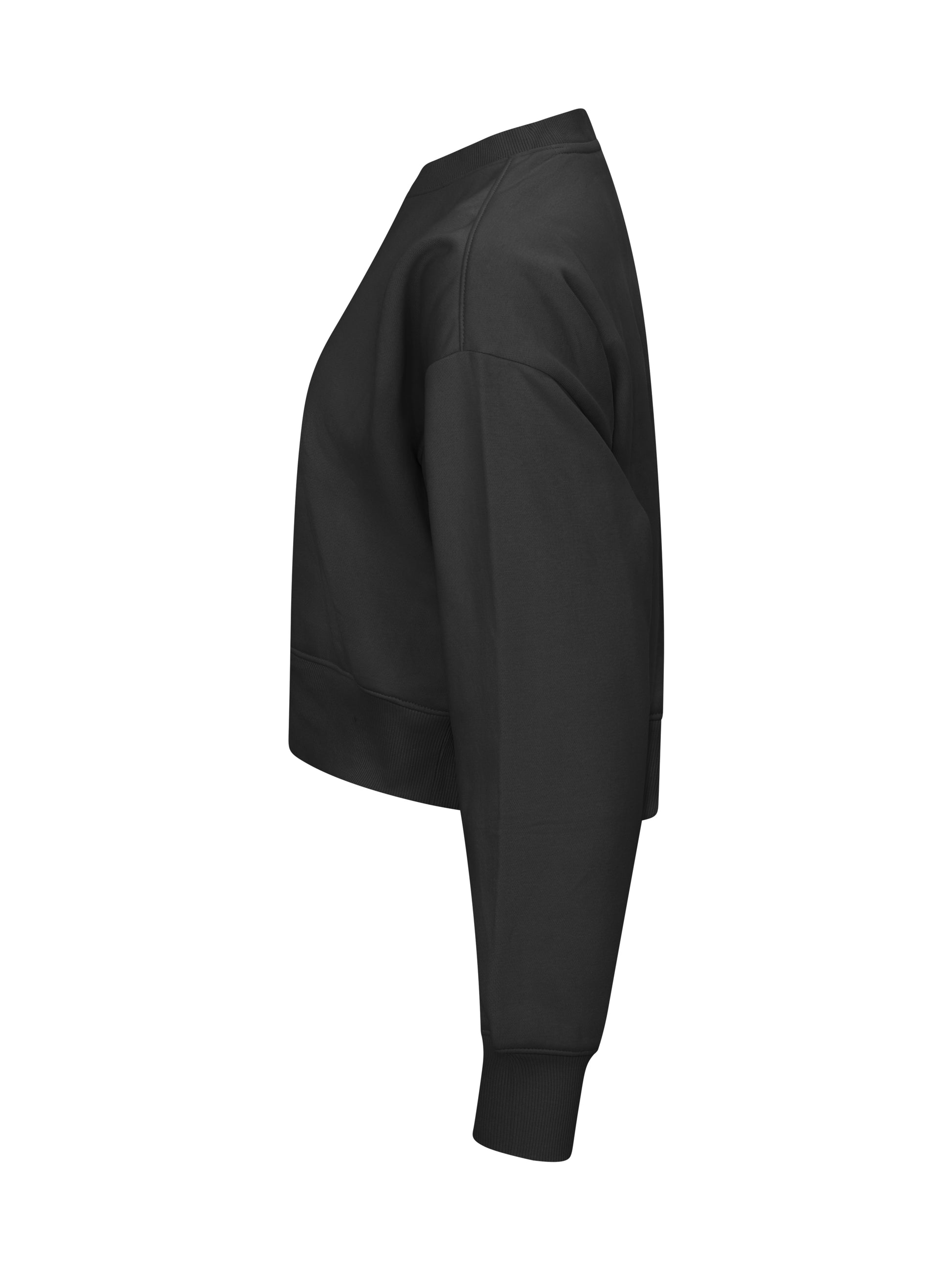 A relaxed cropped sweater made from a cotton and recycled polyester blend. Brushed inside, collar, cuffs and hem in 2x2 rib with a single stitch. Reinforced neck tape and an easy removable label for rebranding. Soft stabilized fabric suitable for intensive washing with anti-pilling finish.